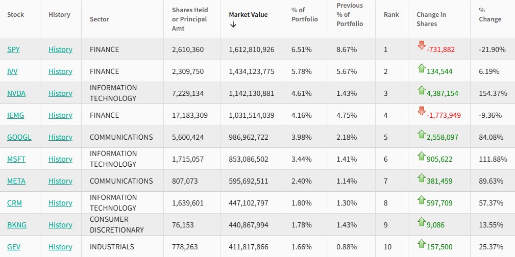 iShares 標普 500 指數 ETF(IVV.US) 位列第二,持倉約 231 萬股,持倉市值約為 14.34 億美元,佔投資組合比例為 5.78%,較上季度持倉數量增加 6.19%。