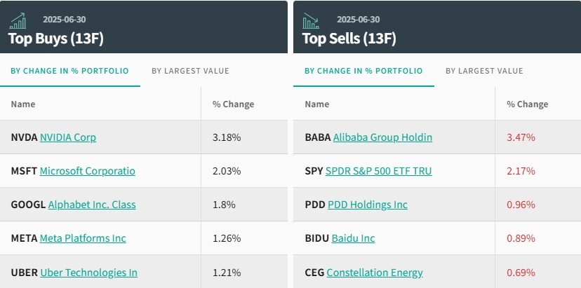 從持倉比例變化來看,前五大買入標的分別是:英偉達、微軟、谷歌、Meta、Uber(UBER.US)。