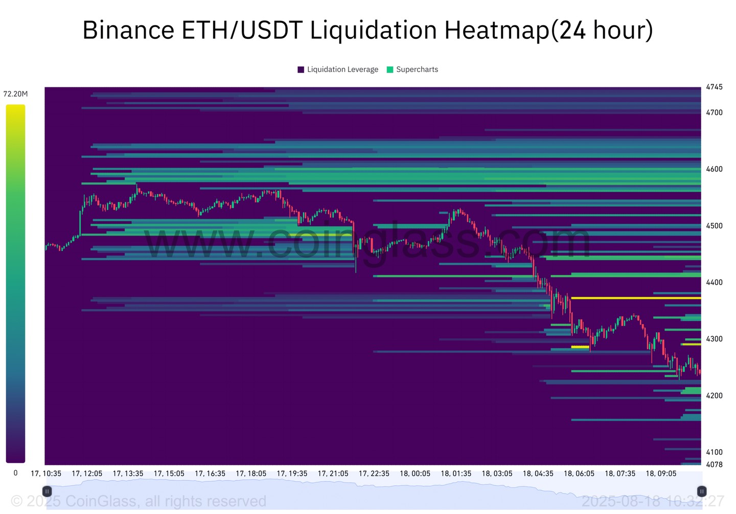 Binance ETH/USDT 清算熱圖突顯了 4200 美元到 4400 美元之間的重清算區域,這些水平最近活動增加。