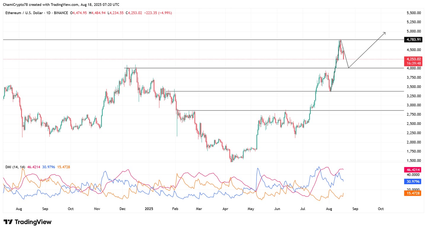 截至發稿時,以太坊的交易價格約為 4253 美元,經歷了 6% 的日內下跌,顯示出在最近上漲至 4783 美元后出現降温跡象。