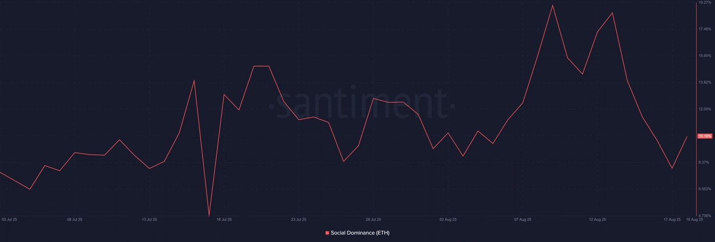 以太坊的社交主導性已上升至 10.16%,最近幾周早期峯值超過 17%。