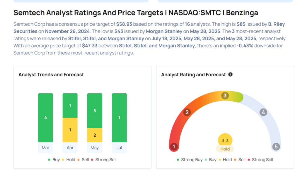 Semtech Corporation (NASDAQ:SMTC) is set to report Q2 earnings on Aug. 25, with expectations of 40 cents per share, up from 11 cents last year. Projected revenue is $256.06 million, compared to $215.35 million a year prior. Analysts have revised their ratings, with Stifel maintaining a Buy and raising the price target to $54, while Morgan Stanley increased theirs to $43. Other analysts also reiterated Buy ratings with varying price targets, reflecting positive sentiment ahead of the earnings call.