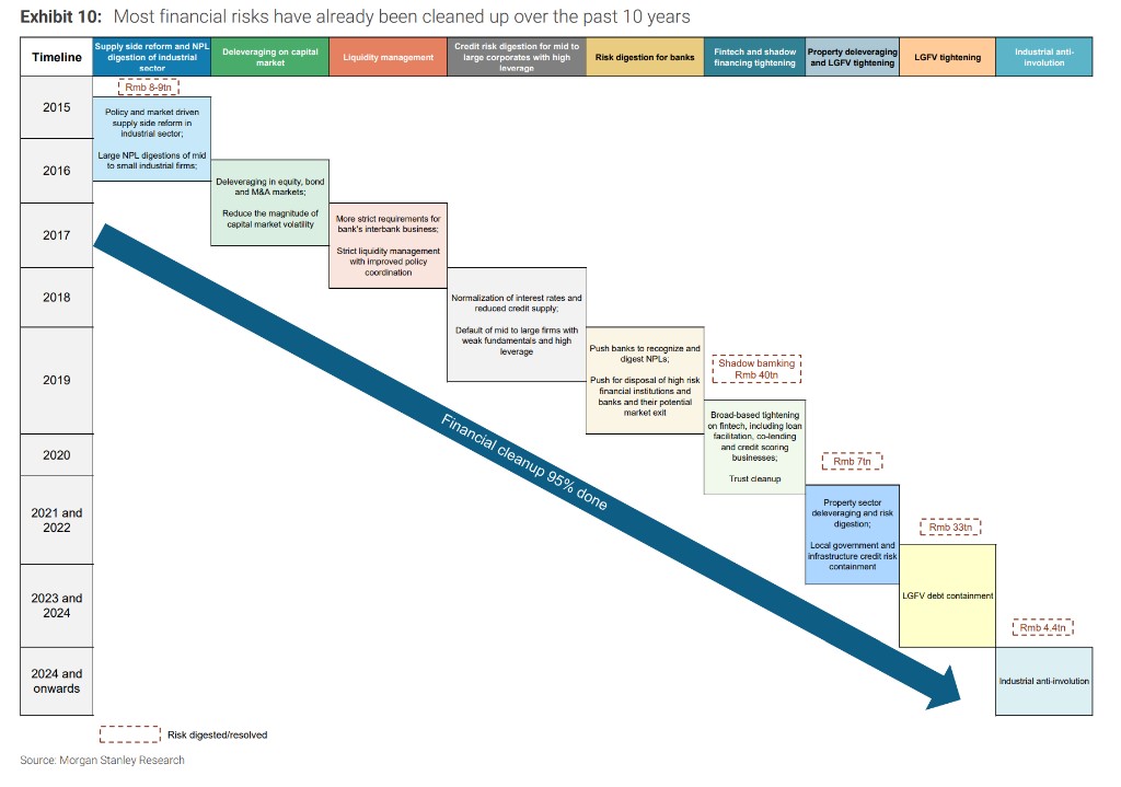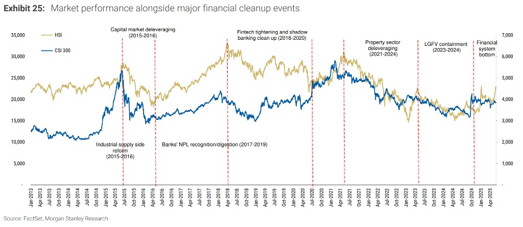 摩根士丹利分析師指出,經過十年的金融清理工作,高風險金融資產已從 2017 年的 62 萬億元人民幣(佔金融資產總額的 30.2%)大幅降至 2025 年的 21 萬億元人民幣(佔比 4.9%)。