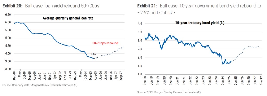 在牛市情形下,大摩預測市場化的金融體系應能推動貸款和金融資產收益率在 3—4 年內回升 50-70 個基點,支持金融企業 7-8% 的收入增長和雙位數利潤增長,在幾年內超過名義 GDP 增長,然後重新與 GDP 增長保持一致。