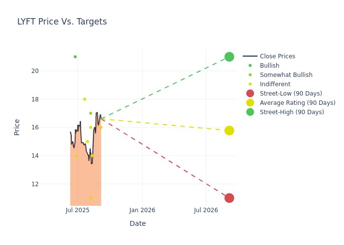 In the assessment of 12-month price targets, analysts unveil insights for Lyft, presenting an average target of $15.77, a high estimate of $21.00, and a low estimate of $11.00. This current average represents a 5.11% decrease from the previous average price target of $16.62.