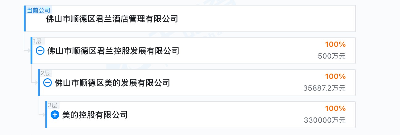 The results of the shareholding penetration show that the actual holder behind Junlan Hotel is Midea Group's major shareholder, Midea Holdings.