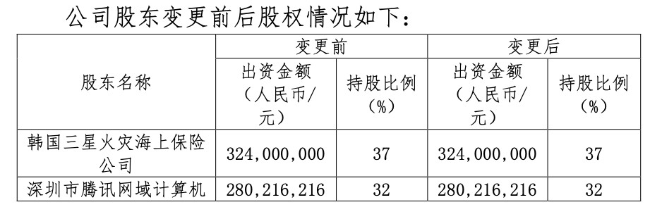 After the capital increase, Korea's Samsung Fire & Marine Insurance maintains a 37% shareholding, making it the largest shareholder; Shenzhen Tencent Network Computing holds 32%, making it the second-largest shareholder; Junlan Hotel and Manbat (Zhangjiagang) Investment Development each hold 11.50%, ranking as the third-largest shareholders.