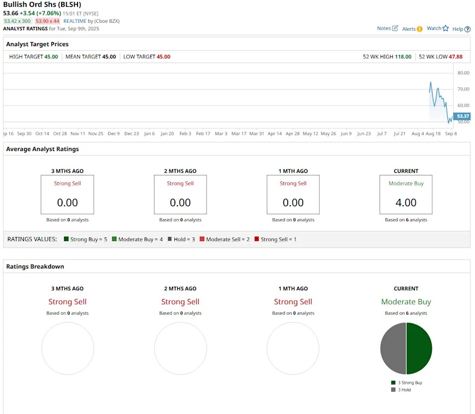 Currently, six analysts tracking Bullish stock unanimously give the stock a "Moderate Buy" rating and set a 12-month target price of $45, which implies a potential downside of about 16% compared to the current stock price level.