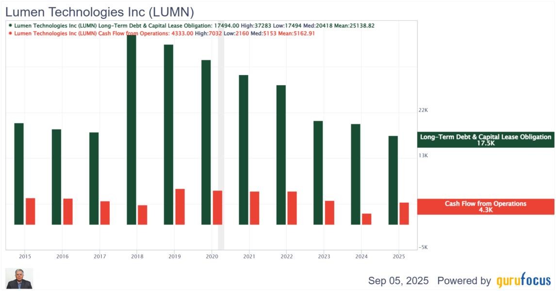 自 Level 3 收購以來,Lumen 的長期債務在過去 8 年中減半。然而,經營現金流保持相對穩定。