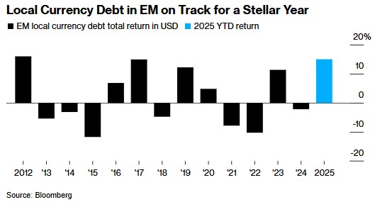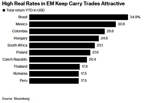 雙重因素疊加下,新興市場政府債券表現碾壓全球多數固定收益資產:15% 的漲幅是美國高收益企業債 (垃圾債) 的兩倍多,更遠超彭博美國國債指數 5.4% 的漲幅。其中,巴西、墨西哥、哥倫比亞、匈牙利、南非領漲,今年以來回報均超 23%。