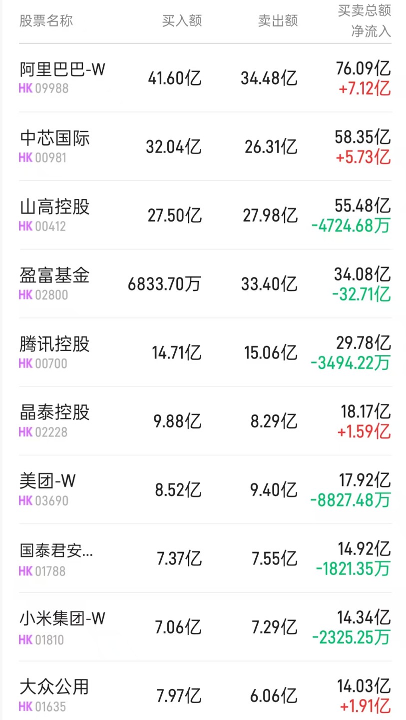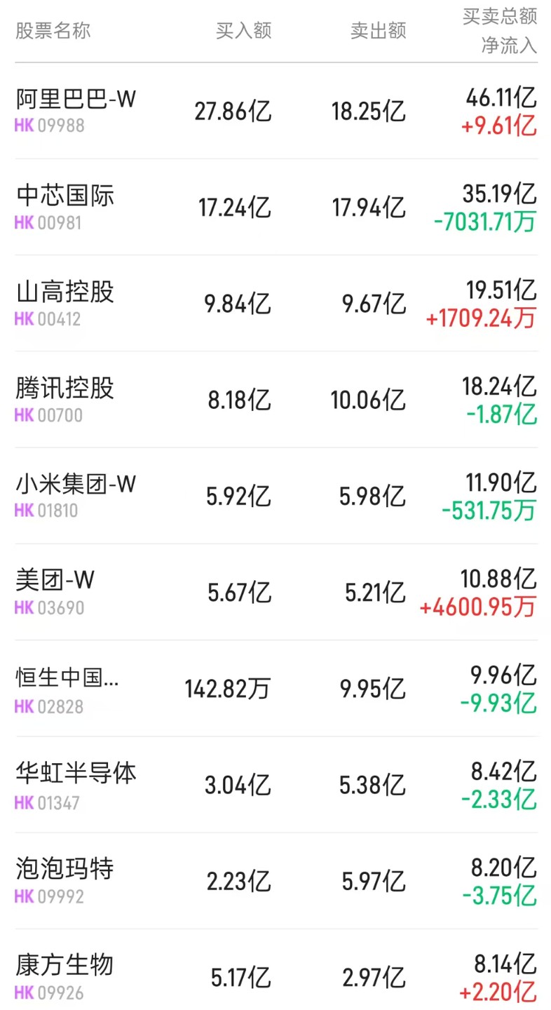 在 9 月 23 日的港股市場,北水成交淨賣出 40.69 億港元,其中港股通 (滬) 淨賣出 23.22 億港元,港股通 (深) 淨賣出 17.47 億港元。阿里巴巴獲淨買入 16.73 億港元,成為北水淨買入最多的個股。阿里巴巴旗下高德宣佈免除全國餐飲商家一年入駐年費,並提供多項支持服務。芯片股方面,中芯國際獲淨買入 5.02 億港元,而華虹半導體遭淨賣出 2.33 億港元。
