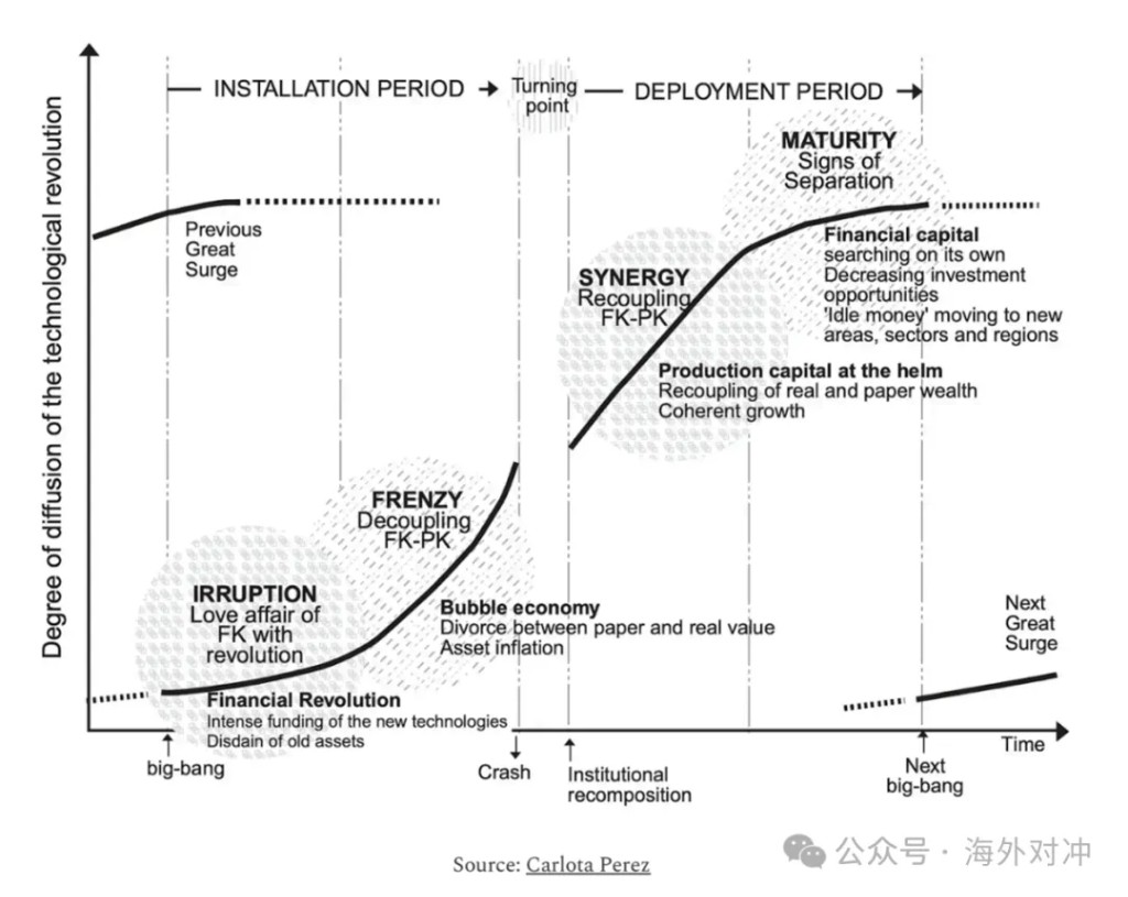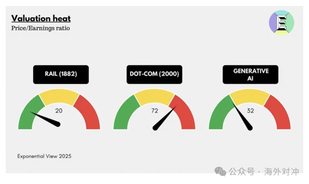 如果说经济压力和行业压力显示的是这场繁荣的 “重量”,收入增长显示的是其 “轨迹”,那么估值热度反映的就是市场情绪。这往往是泡沫最明显的表征:投资者对该领域的定价有多狂热,不管基本面如何。正如卡洛塔·佩雷斯几十年来反复强调的,每次技术革命的早期 “安装阶段”,金融市场往往都会过度投入——投入的资本远远超出近期收入所能证明的合理水平。这种狂热在当时看似非理性,但正是社会铺设新基础设施的机制。问题在于,这股狂热能否顺利过渡到 “部署阶段”,即基础设施变得无处不在、并带来真正的生产力提升。