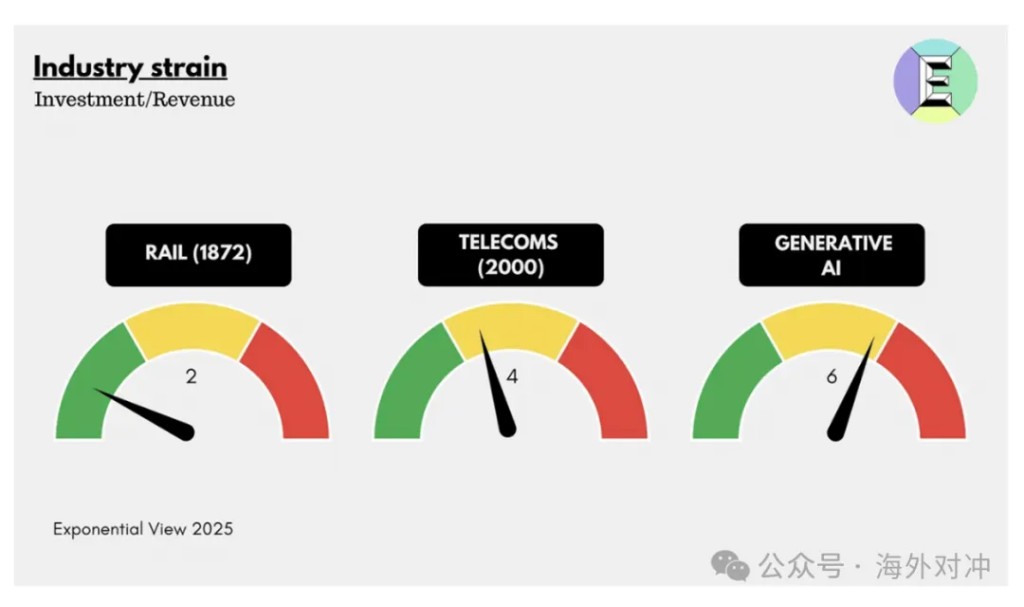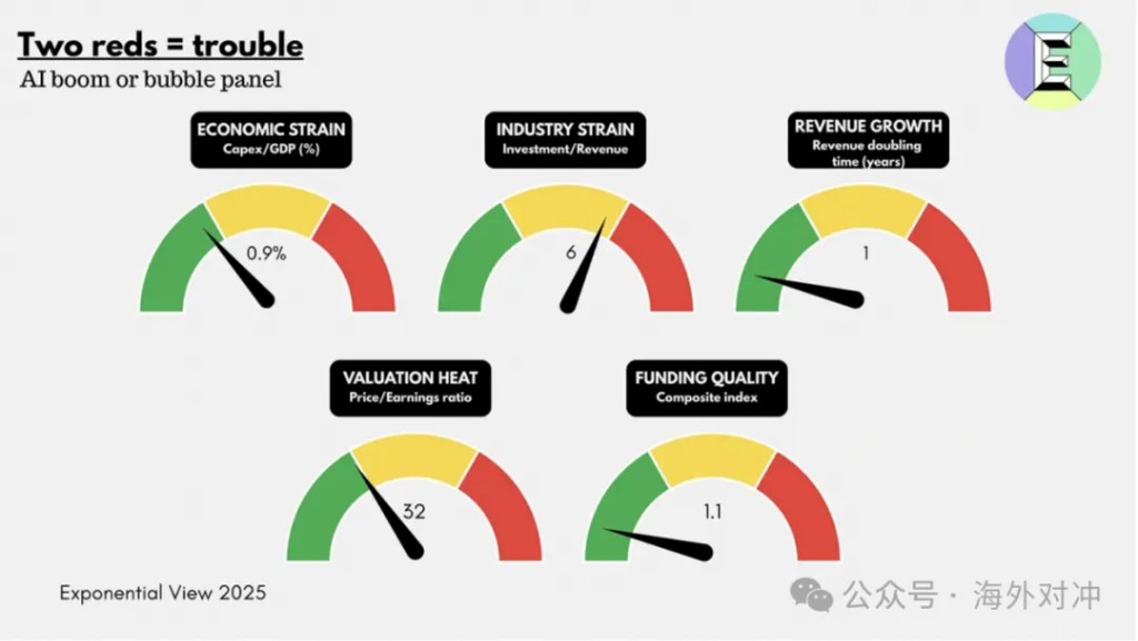 - 当前 AI 行业的资本支出与收入比为 6:1,远高于历史泡沫时期(铁路为 2:1,电信为 4:1),处于 “橙色” 警戒区。