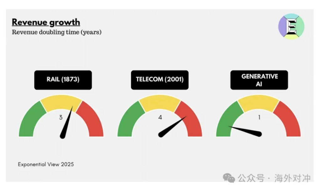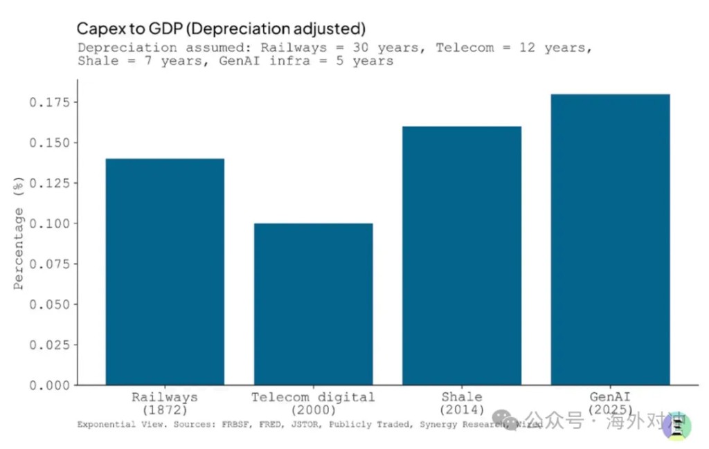 1872 年美国铁路扩张达到高峰时,资本支出约为当年营收的两倍。1990 年代末电信泡沫中,这个比率涨到了将近四倍。而相比之下,如今的 genAI 热潮是用约600亿美元的年收入来支撑全球约3,700亿美元的数据中心资本支出,比率高达6倍,是上述三者中压力最大的。