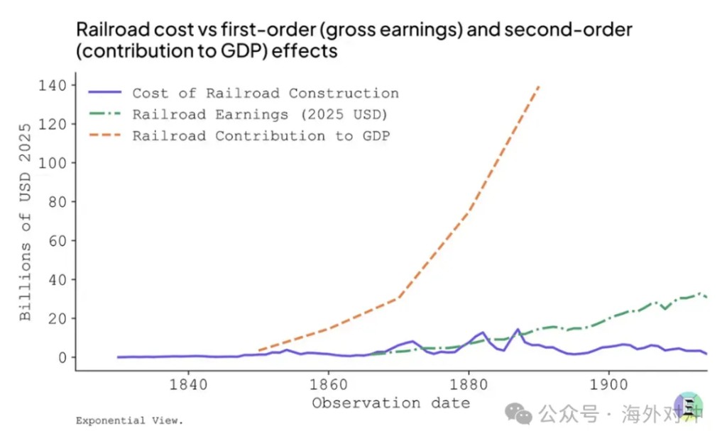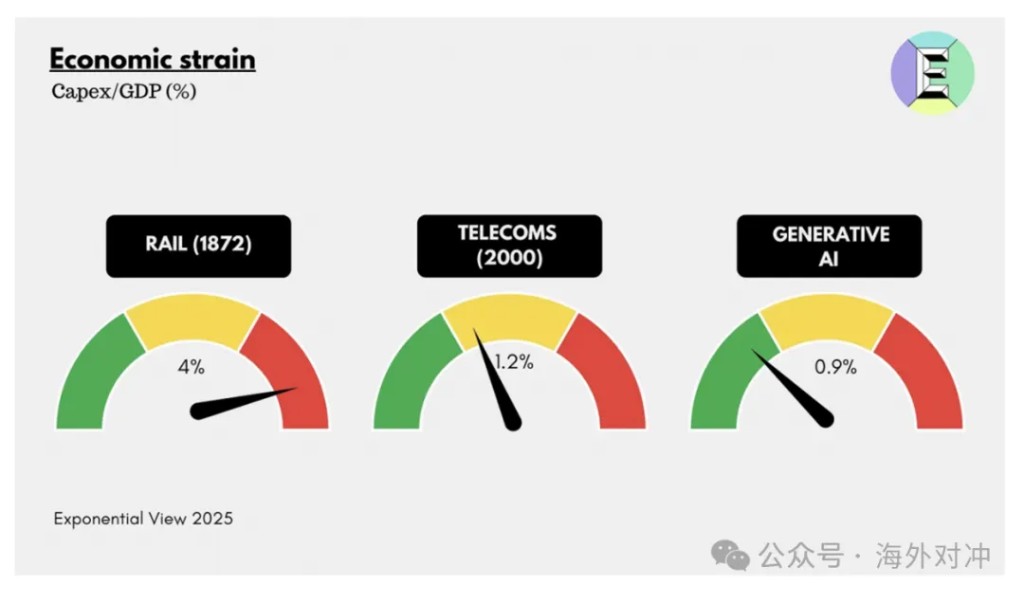 按该指标衡量,铁路泡沫时期的经济负担最重。1872年美国铁路投资曾高达GDP的约4%,正值第一次铁路大崩盘前夕。而1990年代后期电信泡沫的高峰投入则仅接近GDP的1%,这个水平与当下的情况颇为相似。
