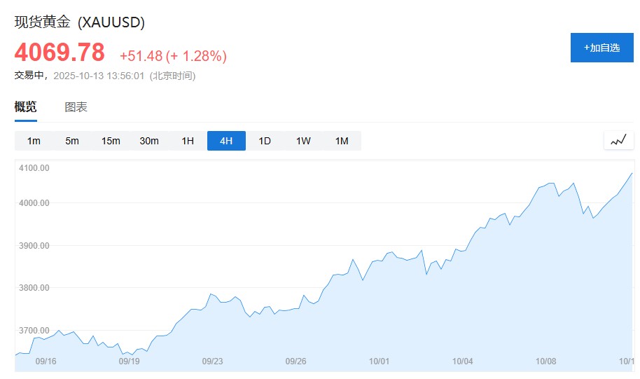 現貨黃金向上觸及 4070 美元/盎司,日內漲近 1.5%。