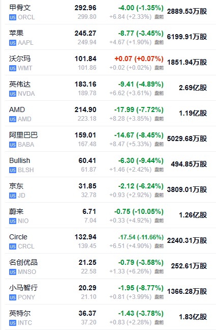 - 美股盤前,明星科技股集體走高,英偉達、AMD 盤前漲超 3%,甲骨文盤前漲近 2%,蘋果漲超 1%,熱門中概股集體上漲,阿里巴巴漲超 5%。