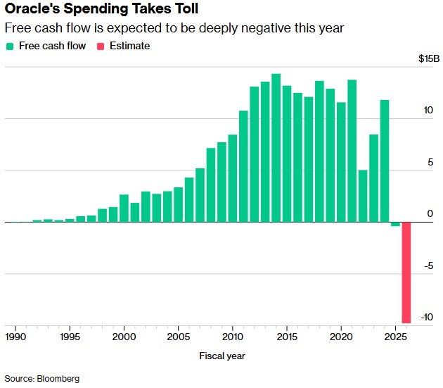 除了利潤率之外,投資者還擔心擴大甲骨文雲計算能力所需的支出。截至今年 5 月的 2026 財年,甲骨文的資本支出預計將達到 354 億美元,較上年增長 67%。因此,自由現金流繼去年自 1990 年以來首次出現虧損後,預計今年將出現 98 億美元的負現金流。