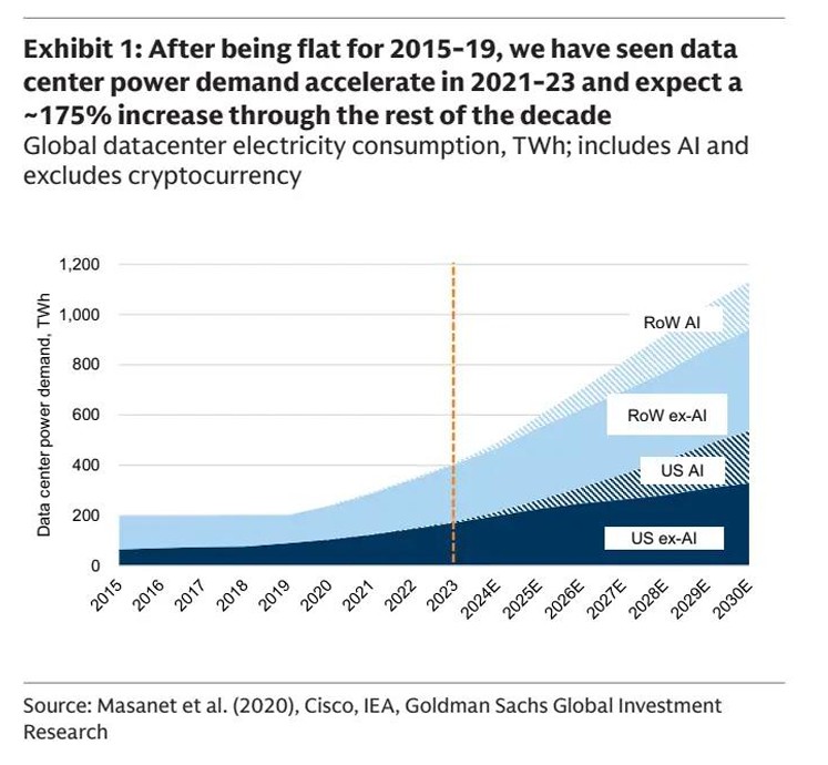 智通財經 APP 獲悉,華爾街金融巨頭高盛在最新研究報告中將全球數據中心 (含 AI+ 非 AI,AI 帶動的增長佔據主導地位) 所驅動的截至 2030 年龐大耗電需求到預測,上修為較 2023 年耗電量大幅擴張 175%(高盛的先前為 +165%),相當於再增加一個 “全球前十耗電大國” 的電力資源負荷。在高盛分析師團隊看來,AI 大模型的盡頭就是電力——該機構強調堪稱 “吞電巨獸” 的 AI 將帶來史無前例的電力股 “超級牛市行情”,在具體投資策略上,高盛建議基於 “6P” 圍繞 “可靠性—可獲得性—效率” 三條投資主線。