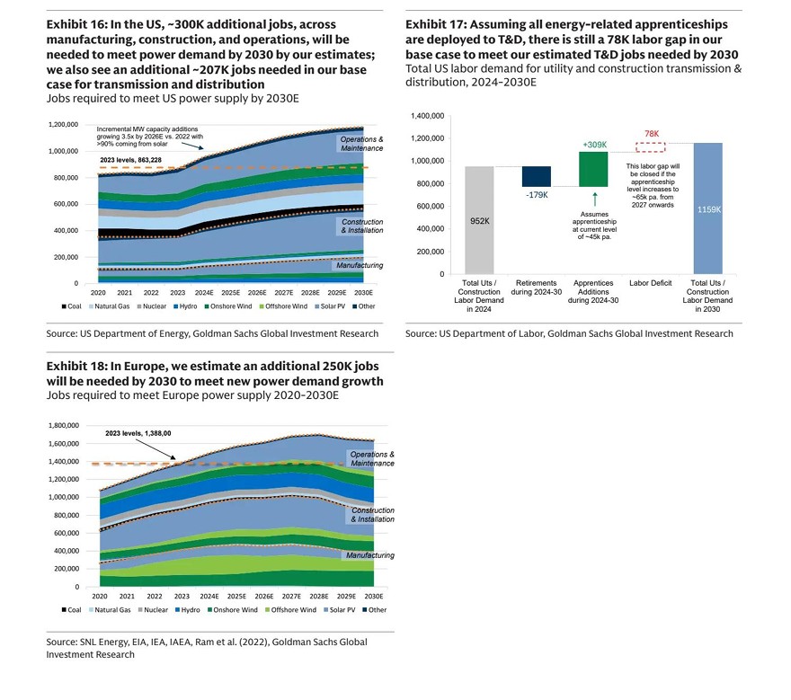 Parts(設備供給) 以及 People(建設與運維勞動力) 方面,高盛分析師團隊表示,勞動力缺口仍然是全球電力市場的重大風險:預計美國到 2030 年電力相關新增崗位大約 30 萬,T&D(輸配電) 另需大約 21 萬;歐洲則需電力崗位大約 25 萬。高盛預計至 2030 年美國電網方面的累計資本開支約 7900 億美元 (高於高盛此前預期的約 7800 億美元),預計大約 67% 投向輸配電/配網層面的強化舉措。