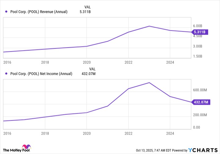 但巴菲特可能喜歡的——也是使 Pool 成為一個有趣的購買選擇的原因——是其領先的市場地位和提供漸進收益增長的能力。在下面的圖表中,數據顯示在 10 年期間,收入和淨收入均實現了三位數的增長。