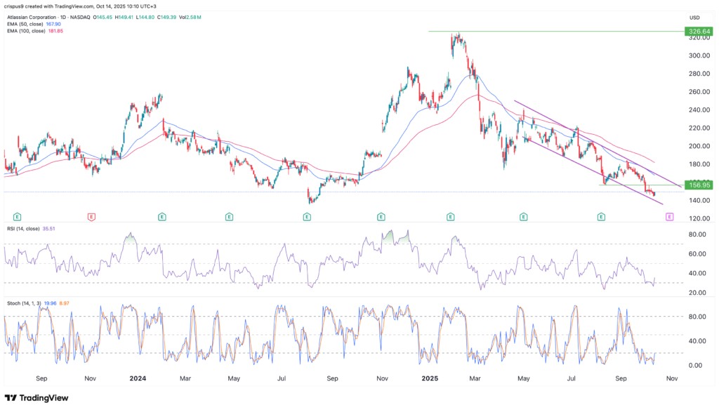 Atlassian stock price continued its strong downtrend this month and is now hovering at its lowest point since August last year. TEAM plunged to a low of $149.40, down by 55% from its highest point this year. This crash has brought its market cap from over $85 billion to $40 billion.