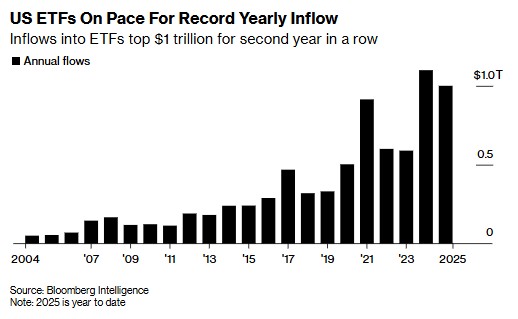 这种最初为平稳分散投资而设计的金融工具,如今已成为市场最响亮的信心宣言,更是 2025 年牛市的 “脉搏”。资金流入速度刷新了该行业 30 年历史中的所有纪录,这一现象表明,各类交易者对这种节税型投资工具的乐观态度,已固化为一种本能反应。仅先锋集团的标普 500 指数追踪 ETF,就吸纳了约 930 亿美元资金;而与比特币、黄金及杠杆交易相关的基金,也均吸引了数十亿美元流入。