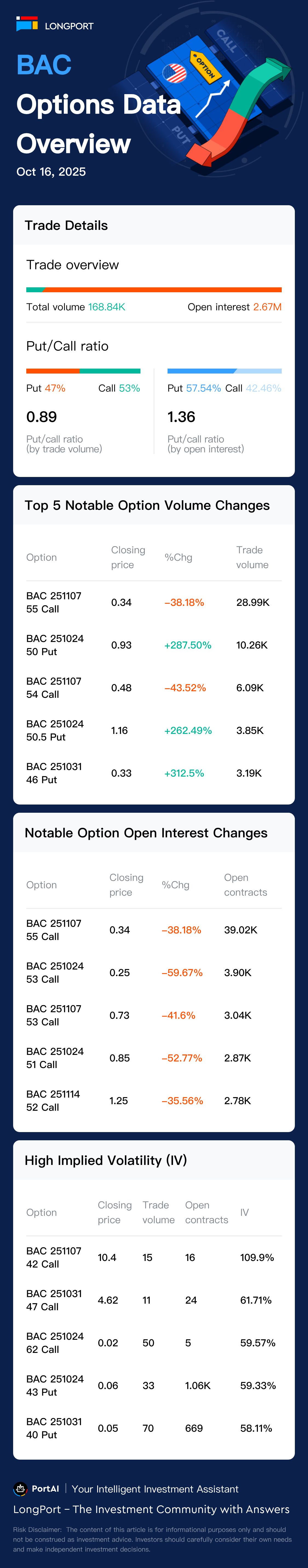 美東時間 2025-10-16,美國銀行期權總成交 450563 張,看漲期權佔比 76%,看跌期權佔比 23%。