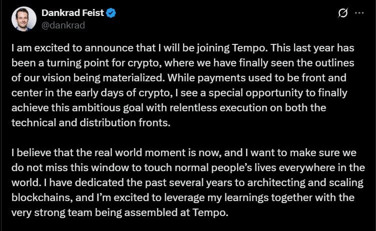Adding to the buzz, veteran Ethereum developer Dankrad Feist has joined Tempo, saying its mission aligns with Ethereum’s broader vision rather than competing with it.