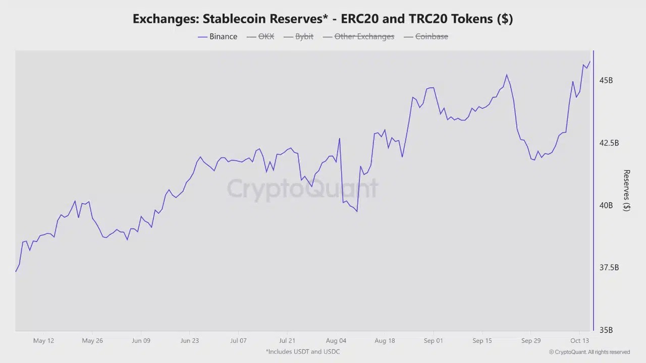 As Bitcoin dipped, Binance’s stablecoin reserves surged to a new all-time high of $45.8 billion. This is a level up from the $41.8 billion recorded at the end of September.