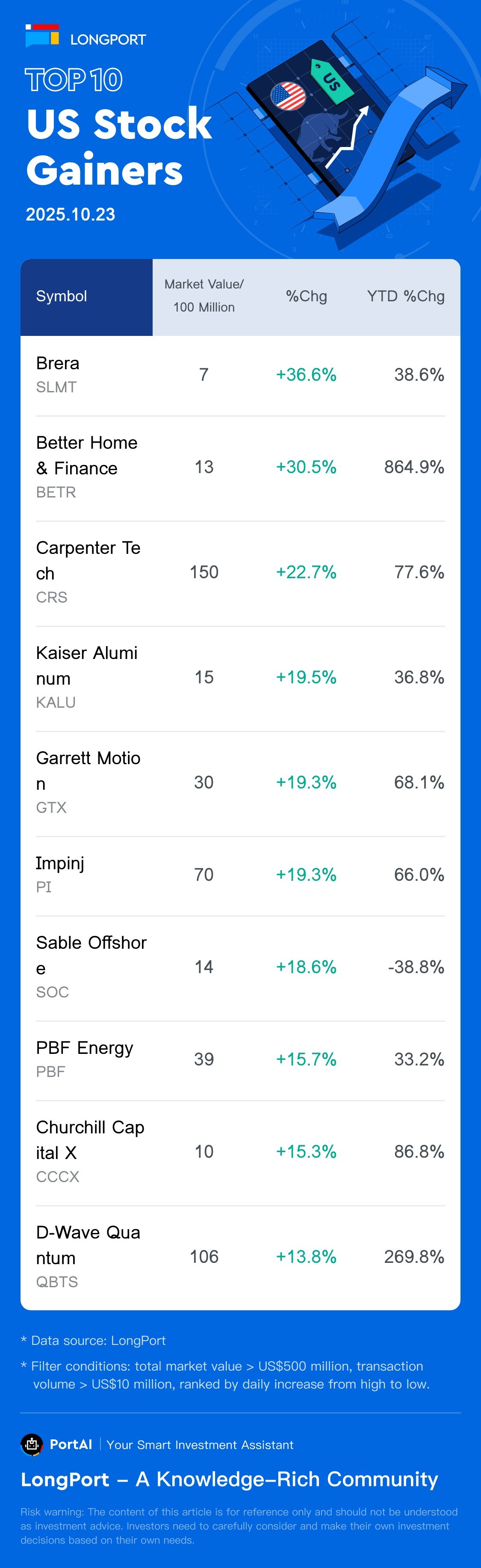 Brera(SLMT) rose 36.65%, with a trading turnover 131.1 Million USD, and a year-to-date rose 38.6%. Better Home & Finance(BETR) rose 30.55%, with a trading turnover 106.7 Million USD, and a year-to-date rose 864.9%. Carpenter Tech(CRS) rose 22.66%, with a trading turnover 1.2 Billion USD, and a year-to-date rose 77.6%.