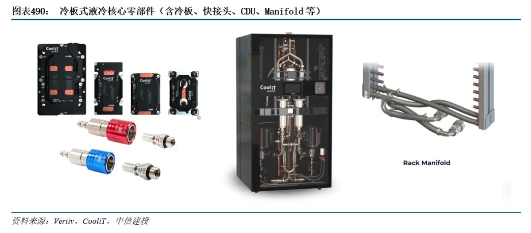 冷板式液冷二次側 (室內側) 核心部件:①液冷板 (Liquid Cooling Plate):液冷板是一種通過液體循環來吸收和轉移熱量的散熱設備,廣泛應用於高性能計算和數據中心。它們通常安裝在服務器或電子設備上,通過液體流動來冷卻設備。②快速斷開裝置 (QD):允許快速方便地連接和斷開液體管線,且不會產生漏液。③冷卻液分配單元 (Coolant Distribution Unit,CDU):負責冷卻劑的分配、調節和監控。它們確保每個服務器都能獲得適量的冷卻液,以維持適宜的運行温度。CDU 分為 L2A,包括:RPU(泵、水箱)、散熱片、風扇。以及 L2L,包括:RPU 和釺焊板式換熱器 (BPHE)。④機櫃內部管線 (Manifold):櫃內管線包括 Rack Manifold(機架管) 和 Row Manifold(行管),是液冷系統中用於分配冷卻液的管道系統。Rack Manifold 負責將冷卻液分配到機架中的各個服務器。Row Manifold 則負責在機架內部分配冷卻液到每行的服務器。