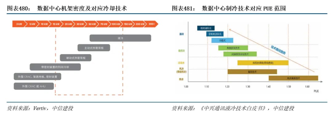 高算力需求推動算力中心單機功率密度提升。風冷系統通過讓冷源更靠近熱源,或者密封冷通道/熱通道的方案,來適應更高的熱密度散熱需求。隨着機架密度升至 20kW 以上,多種液冷技術應運而生,從而滿足高熱密度機櫃的散熱需求。算力中心綠色低碳發展持續深化的需要。PUE(Power Usage Effectiveness,數據中心總能耗/IT 設備實際能耗) 是算力中心最常見的評價性能指標,也是行業評價算力中心綠色性能的主要衡量指標,PUE 值越接近於 1,代表算力中心的綠色化程度越高。液冷技術主要分為冷板式、浸沒式和噴淋式液冷技術等技術類型,其中冷板式液冷技術作為成熟度最高、應用最廣泛的液冷散熱方案。