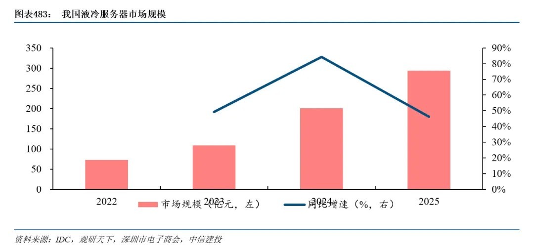 液冷服務器市場規模不斷提升,冷板式液冷仍佔主力。從市場規模來看,觀研天下數據顯示,2024 年中國液冷服務器市場規模將達 201 億元,同比增長 84.4%,預計 2025 年市場規模增速為 46.3%,達 294 億元。從市場結構來看,2024 年冷板式液冷市場佔比約 65%;浸沒式液冷市場佔比約 34%,噴淋式液冷市場佔比約 1%。