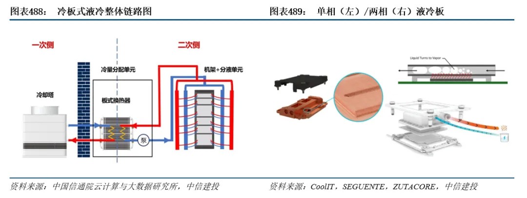 冷板式液冷技術:通過冷板將芯片等發熱元器件的熱量間接傳遞給封閉在循環管路中的冷卻液體,冷卻液帶走熱量,並將其傳遞到一次側迴路,通過冷卻系統進行冷卻,最後將熱量排出系統。冷板式液冷系統可以分為一次側 (室外) 循環和二次側循環 (室內) 兩部分。其中,二次側循環主要通過冷卻液温度的升降實現熱量轉移,而一次側的熱量轉移主要是通過水温的升降實現。成本方面,一次側佔到液冷成本的 30% 左右,二次側佔 70% 左右。