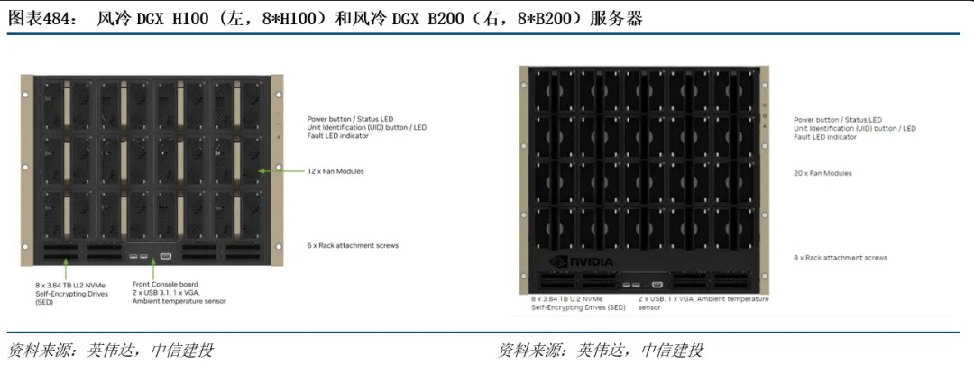 風冷散熱:該方案實現方式為將風冷組件 (包含熱界面材料 (TIM)、集成散熱器 (IHS)、3DVC 和風扇) 安置在計算平台的前端。DGX H100 風冷方案 (含 8 片 H100 GPU):計算平台最前端裝有 3 行 *4 列風扇用於 8 卡 H100 的散熱;DGX B200 風冷方案 (含 8 片 B200 GPU):計算平台最前端裝有 4 行 *5 列風扇用於 8 卡 B200 的散熱。