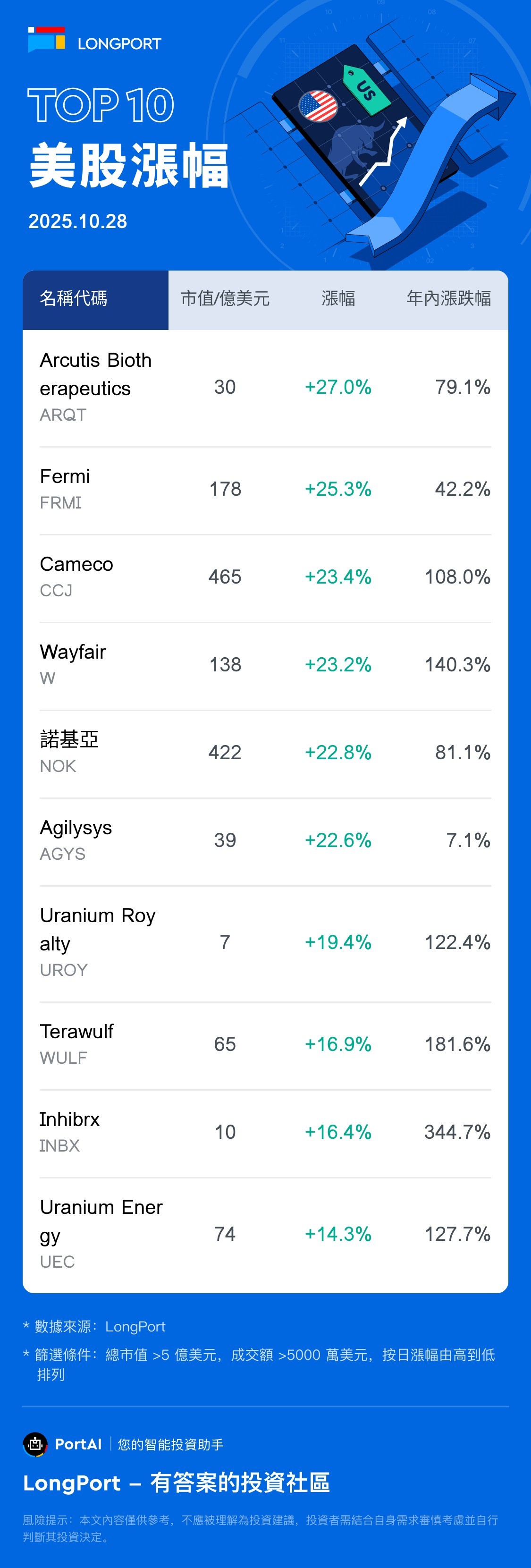 Arcutis Biotherapeutics(ARQT) 涨 27.04%,成交额 3.0 亿美元,年内累计涨 79.1%。 Fermi(FRMI) 涨 25.3%,成交额 3.2 亿美元,年内累计涨 42.2%。 Cameco(CCJ) 涨 23.42%,成交额 25.9 亿美元,年内累计涨 108%。