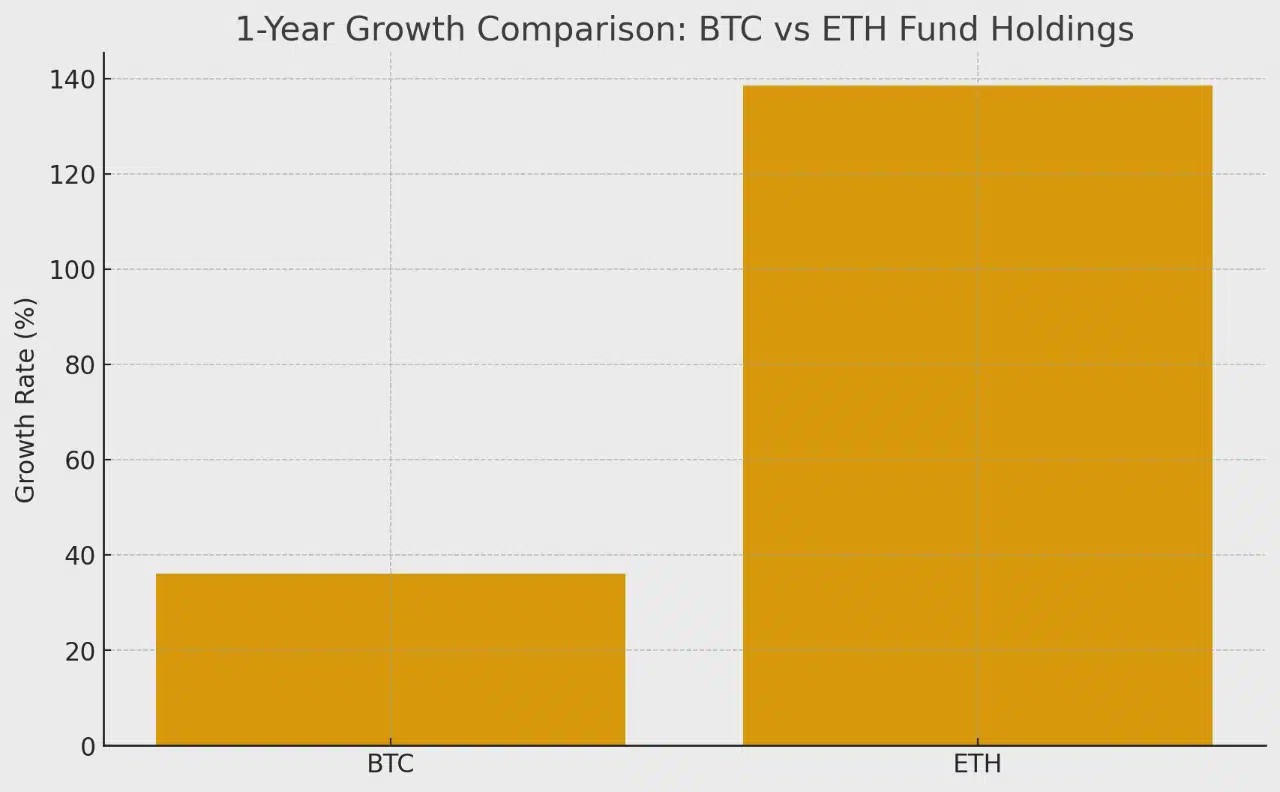 Institutional ETH fund holdings have surged 138% in a year, nearly four times Bitcoin’s 36% growth.