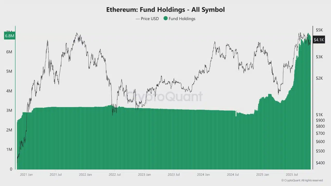 Fund data shows ETH holdings have surged 138% year-over-year to roughly 6.8 million ETH. This is heavily driven by spot ETF inflows, staking yields, and its expanding role in DeFi and tokenization.