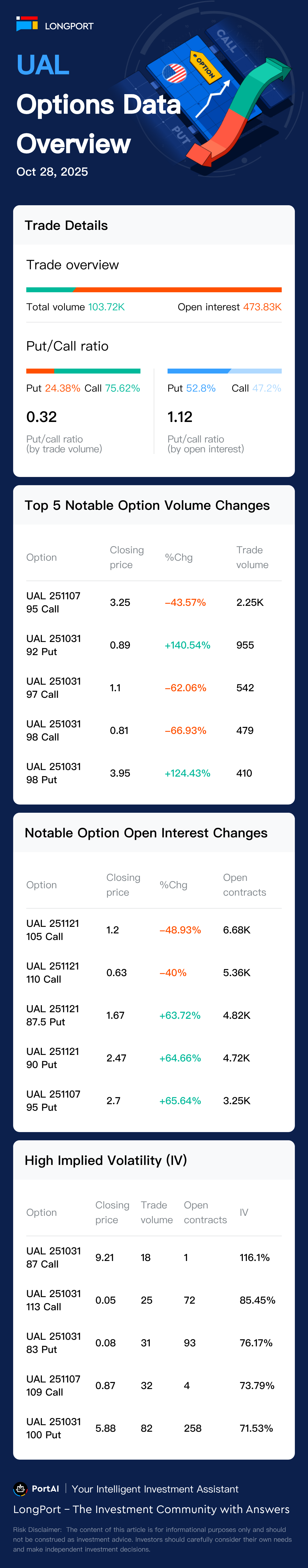 On October 28, Eastern Time, United Airlines options saw a total of 170223 contracts traded, with calls accounting for 73% and puts making up 26%.