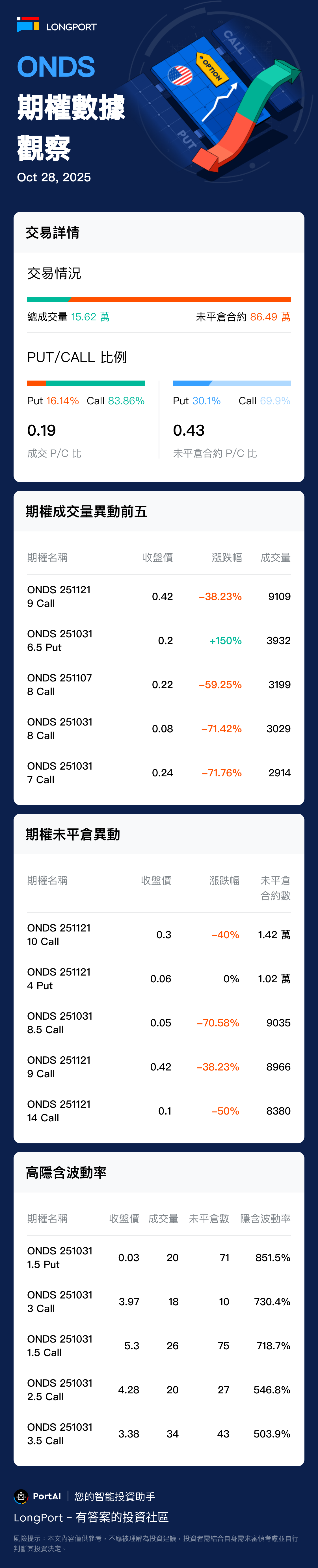 美東時間 2025-10-28,Ondas Holdings Inc.期權總成交 149230 張,看漲期權佔比 81%,看跌期權佔比 18%。