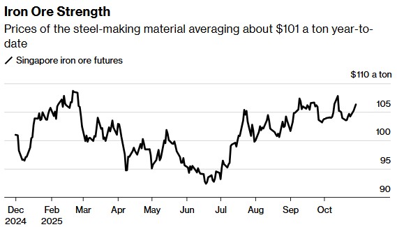 According to Zhitong Finance APP, supported by macroeconomic factors, tightening inventories, and strong steel production in China, Goldman Sachs has raised its iron ore price forecast for 2026, but still expects prices to decline from current levels next year. Analysts, including Aurelia Waltham, stated in a report that Goldman Sachs expects the average price of iron ore in 2026 to be USD 93 per ton, which is USD 5 higher than the previous forecast.