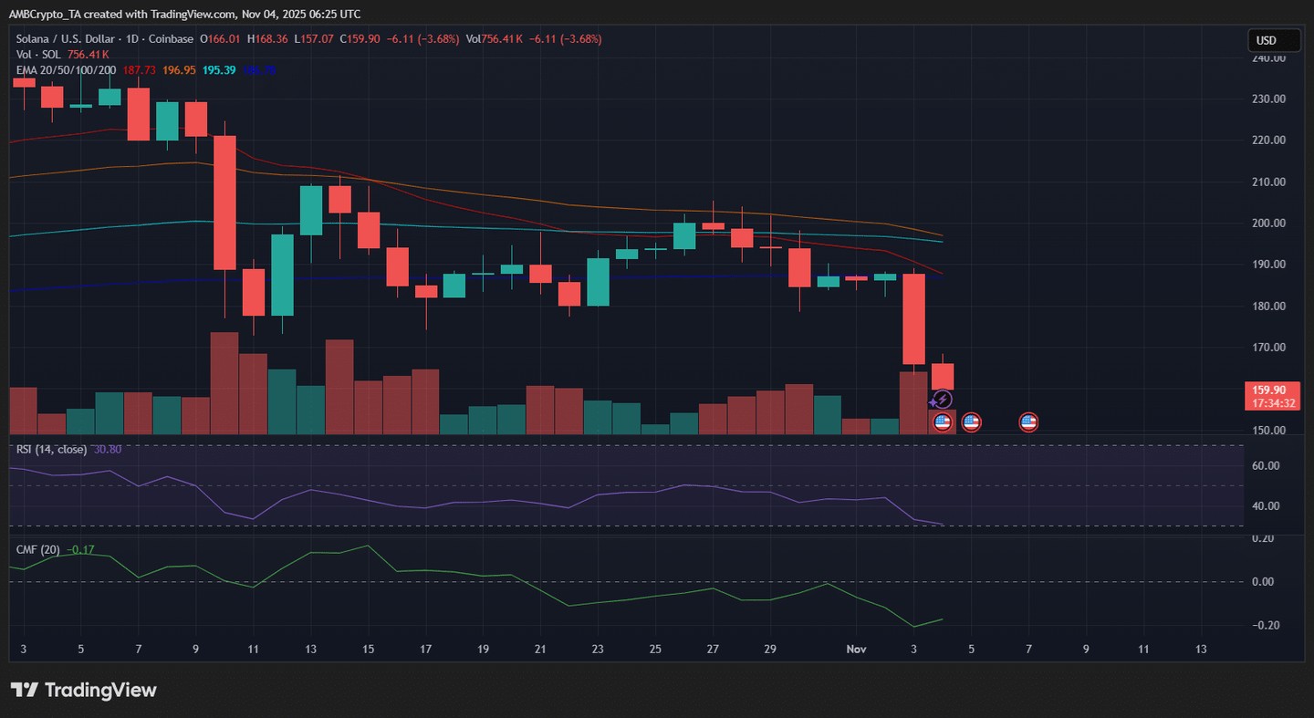 Solana’s daily chart showed price slipping to around $159 at press time, with sellers still in control. EMA lines remained stacked above price, showing continued downside pressure. RSI was close to oversold territory.
