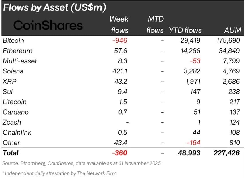 CoinShares data shows SOL pulled in $421.1 million in weekly inflows (the highest among all assets) while Bitcoin [BTC] saw $946 million leave the market, making BTC the main driver of the total outflow count.