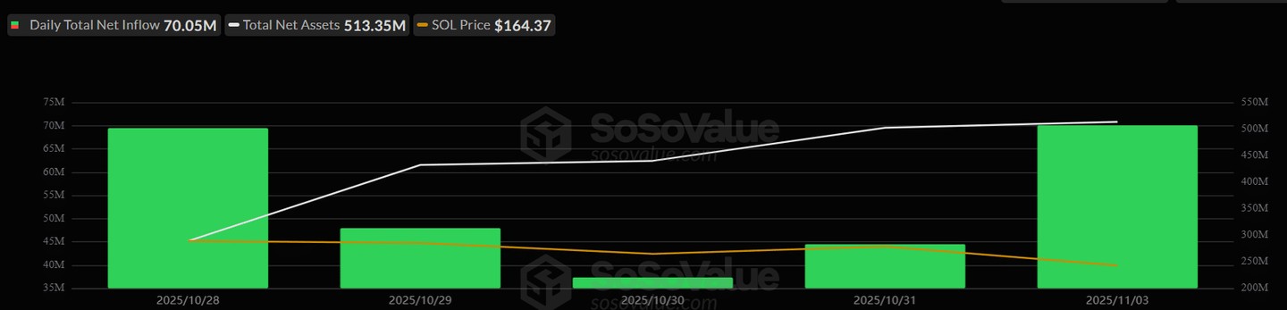Recent data shows that Solana ETF inflows remained consistently strong throughout the past week, with two notable spikes of approximately $70 million each. This pushed total ETF net assets above $500 million. But price didn’t follow the same path.