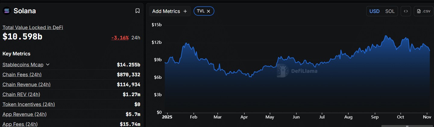 At the same time, DeFiLlama data shows Solana’s TVL sitting at $10.59 billion, down about 3% in 24 hours. So, perhaps capital is entering via ETFs faster than on-chain markets can reflect.
