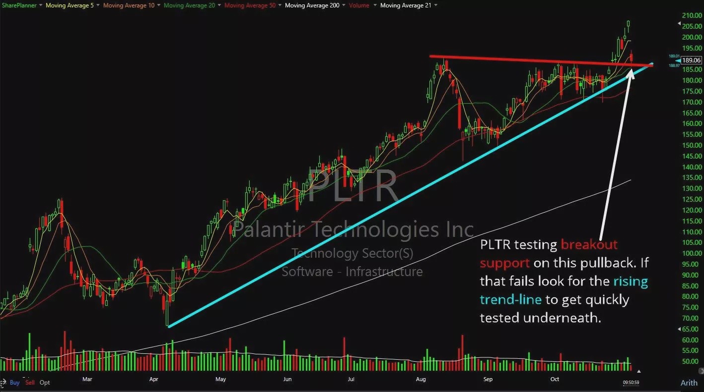 Palantir Technologies (PLTR) 在此次回调中测试突破支撑。如果失败,请关注上升趋势线是否会迅速被测试。