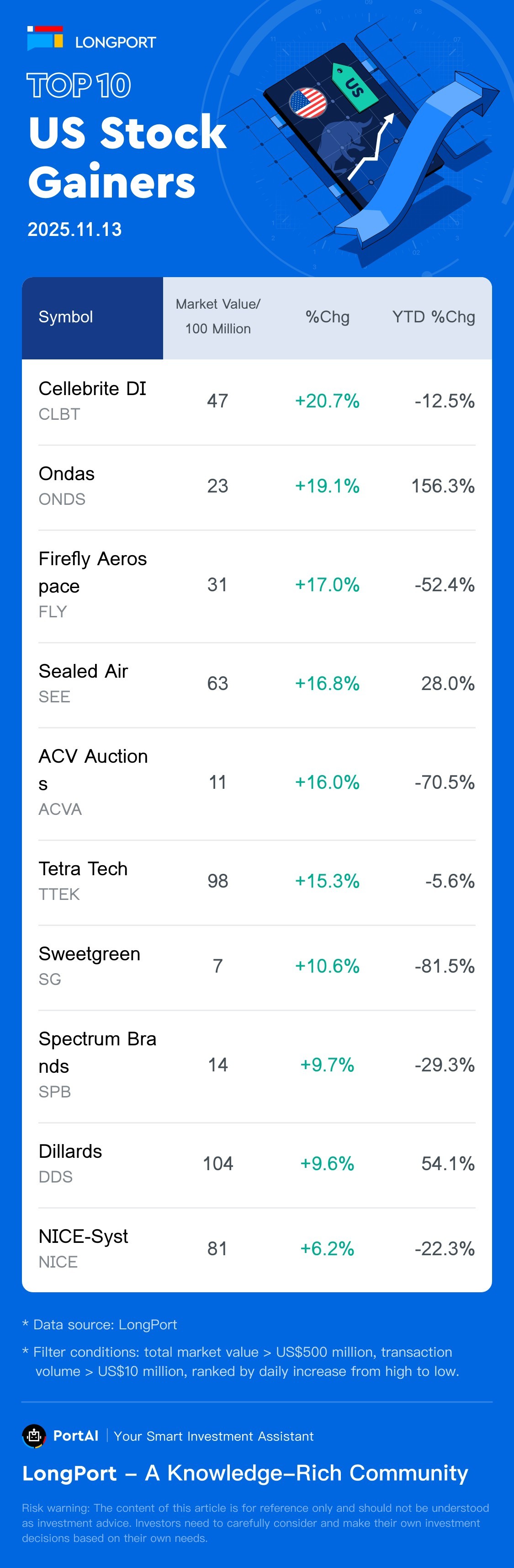 Cellebrite DI(CLBT) rose 20.73%, with a trading turnover 96.6 Million USD, and a year-to-date fell 12.5%. Ondas(ONDS) rose 19.06%, with a trading turnover 1.5 Billion USD, and a year-to-date rose 156.3%. Firefly Aerospace(FLY) rose 16.99%, with a trading turnover 178.6 Million USD, and a year-to-date fell 52.4%.