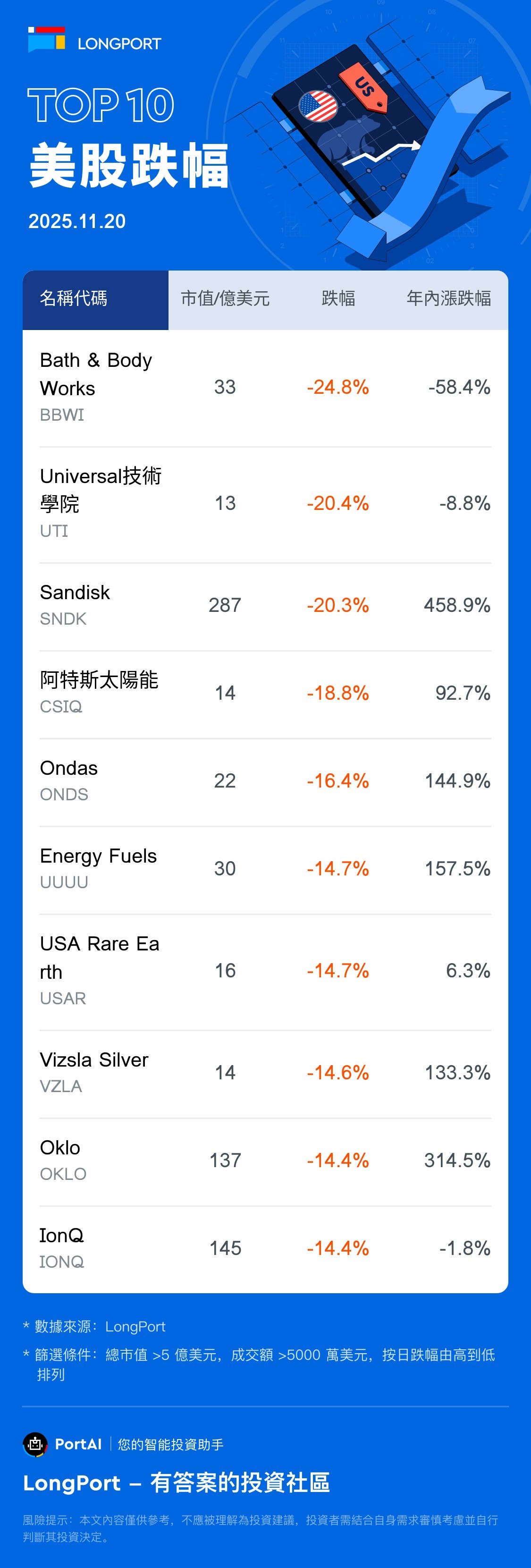 Bath & Body Works(BBWI) 跌 24.81%,成交额 6.5 亿美元,年内累计跌 58.4%。 Universal 技術學院 (UTI) 跌 20.45%,成交额 6568.9 万美元,年内累计跌 8.8%。 Sandisk(SNDK) 跌 20.33%,成交额 56.9 亿美元,年内累计涨 458.9%。