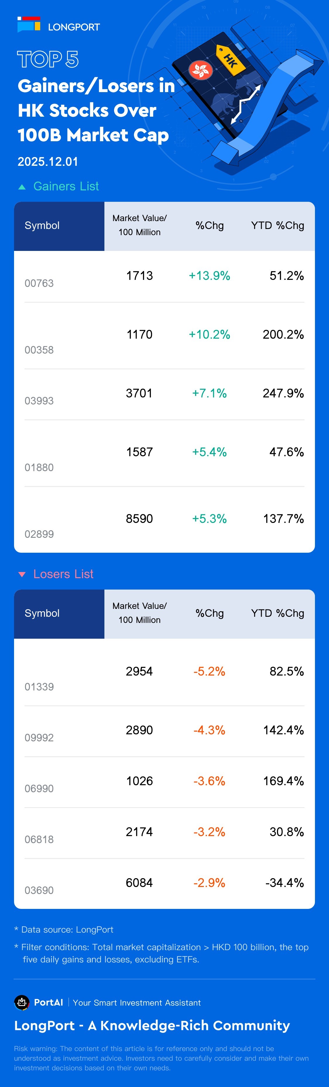 ZTE(00763) rose 13.94%, with a trading turnover 3.8 Billion HKD, and a year-to-date rose 51.2%. JIANGXI COPPER(00358) rose 10.17%, with a trading turnover 1.4 Billion HKD, and a year-to-date rose 200.2%. PICC GROUP(01339) fell 5.25%, with a trading turnover 662.3 Million HKD, and a year-to-date rose 82.5%. POP MART(09992) fell 4.27%, with a trading turnover 3.2 Billion HKD, and a year-to-date rose 142.4%.